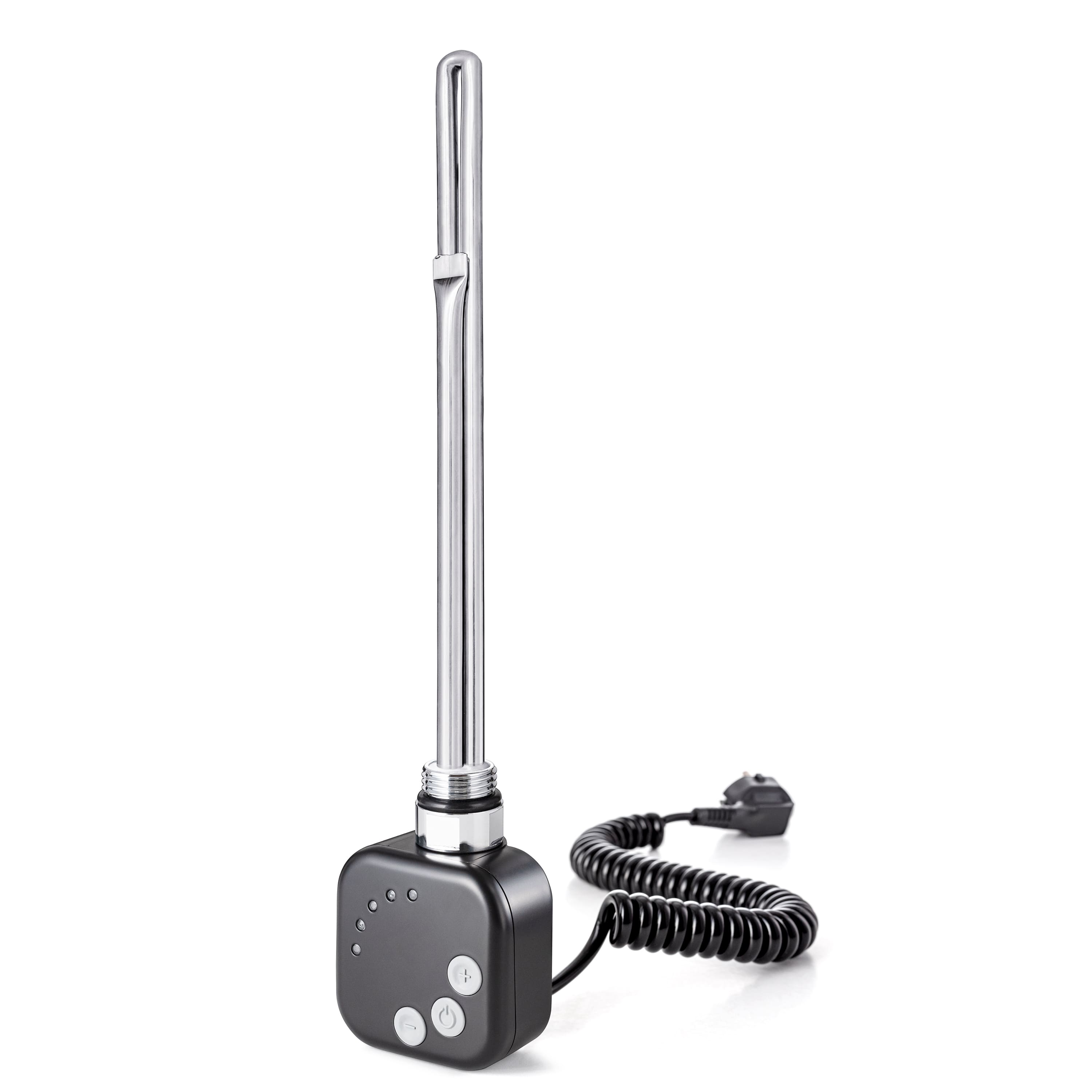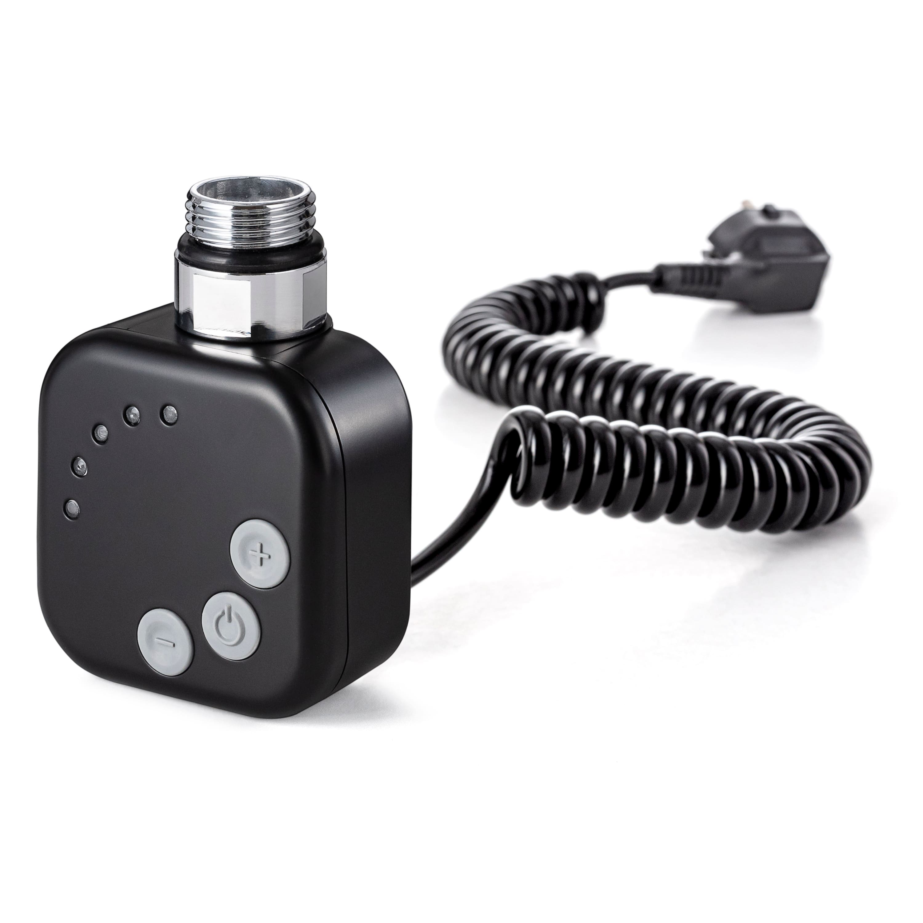 Terma Calore električni grijač za radijatore, s termostatom, 1000W, crne boje. Električni grijač za radijator se koristi kao osnovni izvor zagrijavanja kupaonskih radijatora u slučajevima kad ne postoji instalacija centralnog grijanja ili kao dodatni izvor ako je sustav centralnog grijanja ugašen. Za optimalan rad radijatora s instaliranim električnim grijačem, snaga električnog grijača ne smije biti veća od snage radijatora na koji se grijač instalira. Preporuka je radijator sa ugrađenim električnim grijačem puniti mješavinom voda/glikol. Grijač nije prikladan za radijatore punjene uljem. Karakteristike: • Jednostavna primjena • Optimalna potrošnja električne energije • Snaga: 1000W • Boja: crna • Promjer priključka: 1/2"