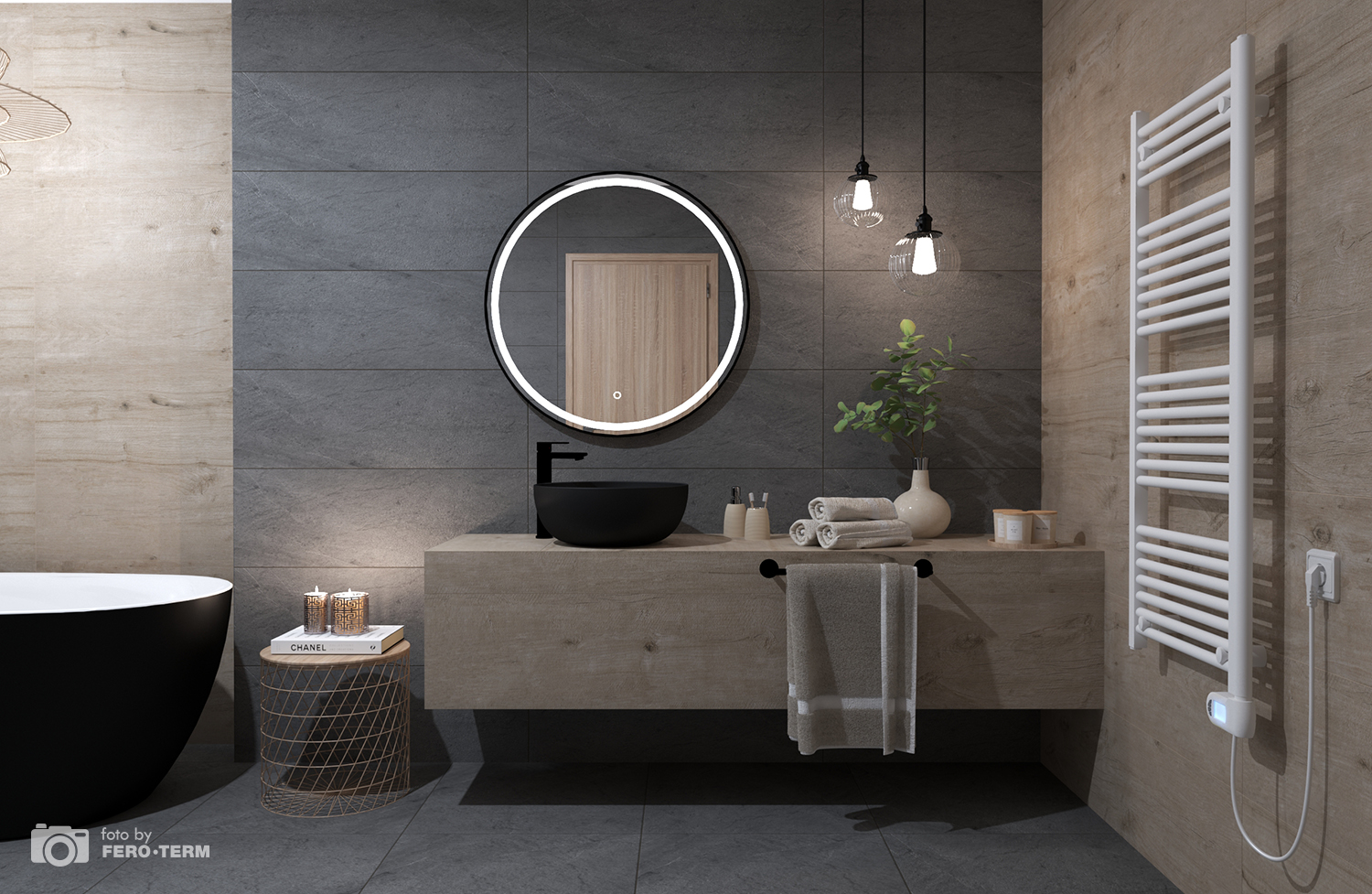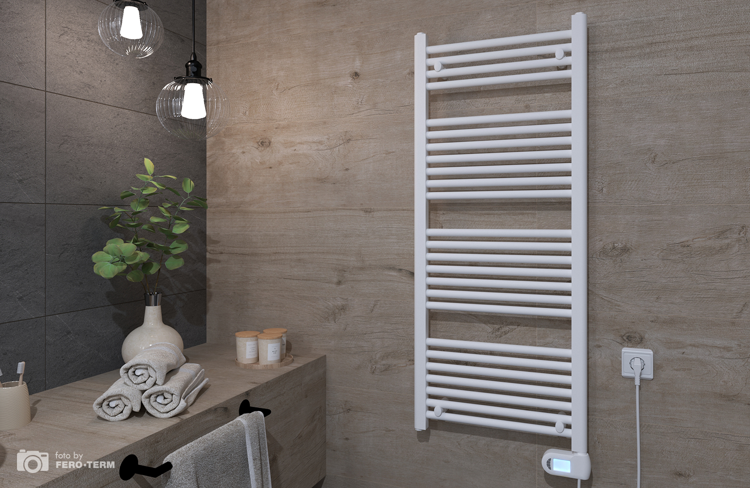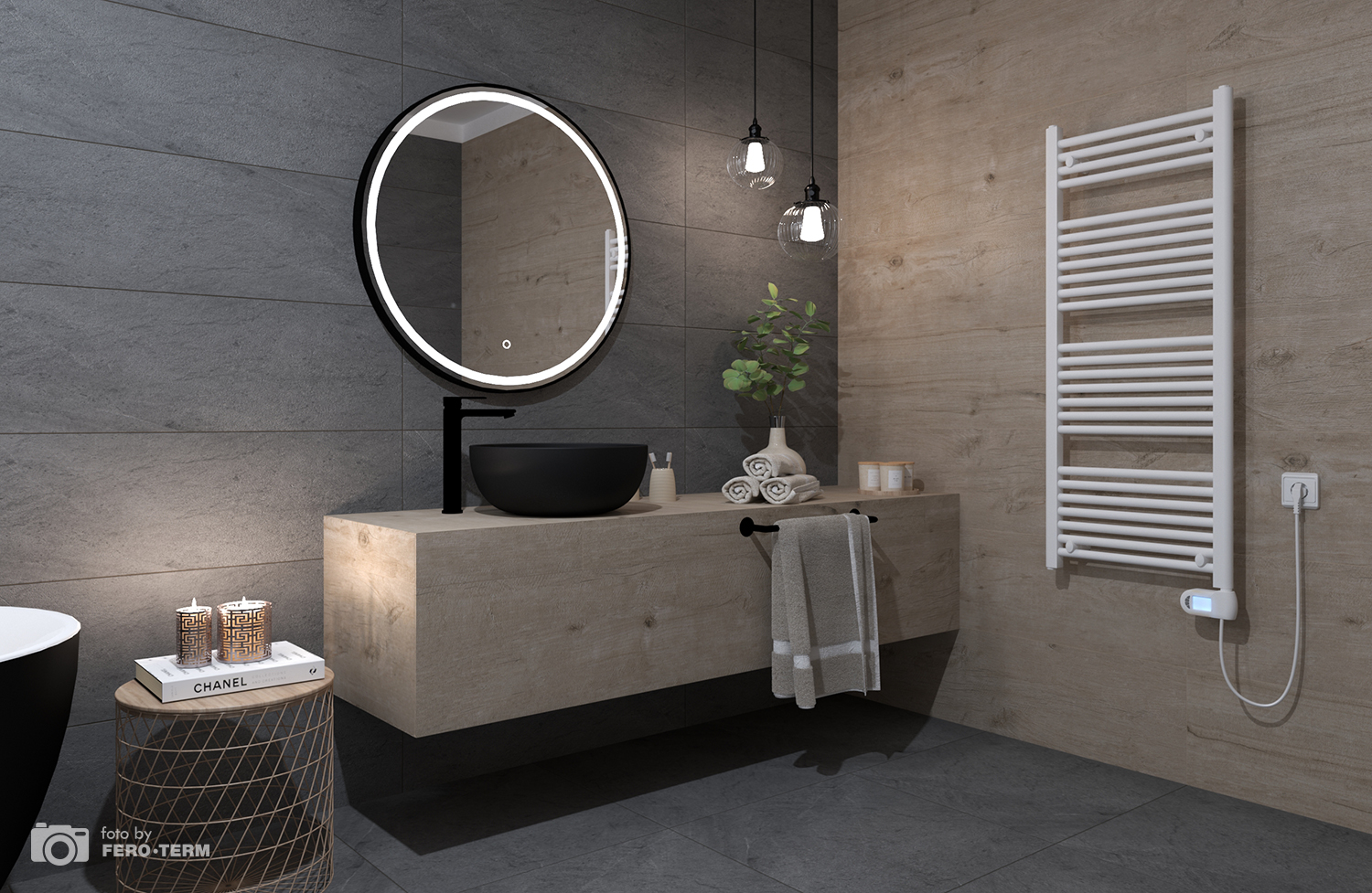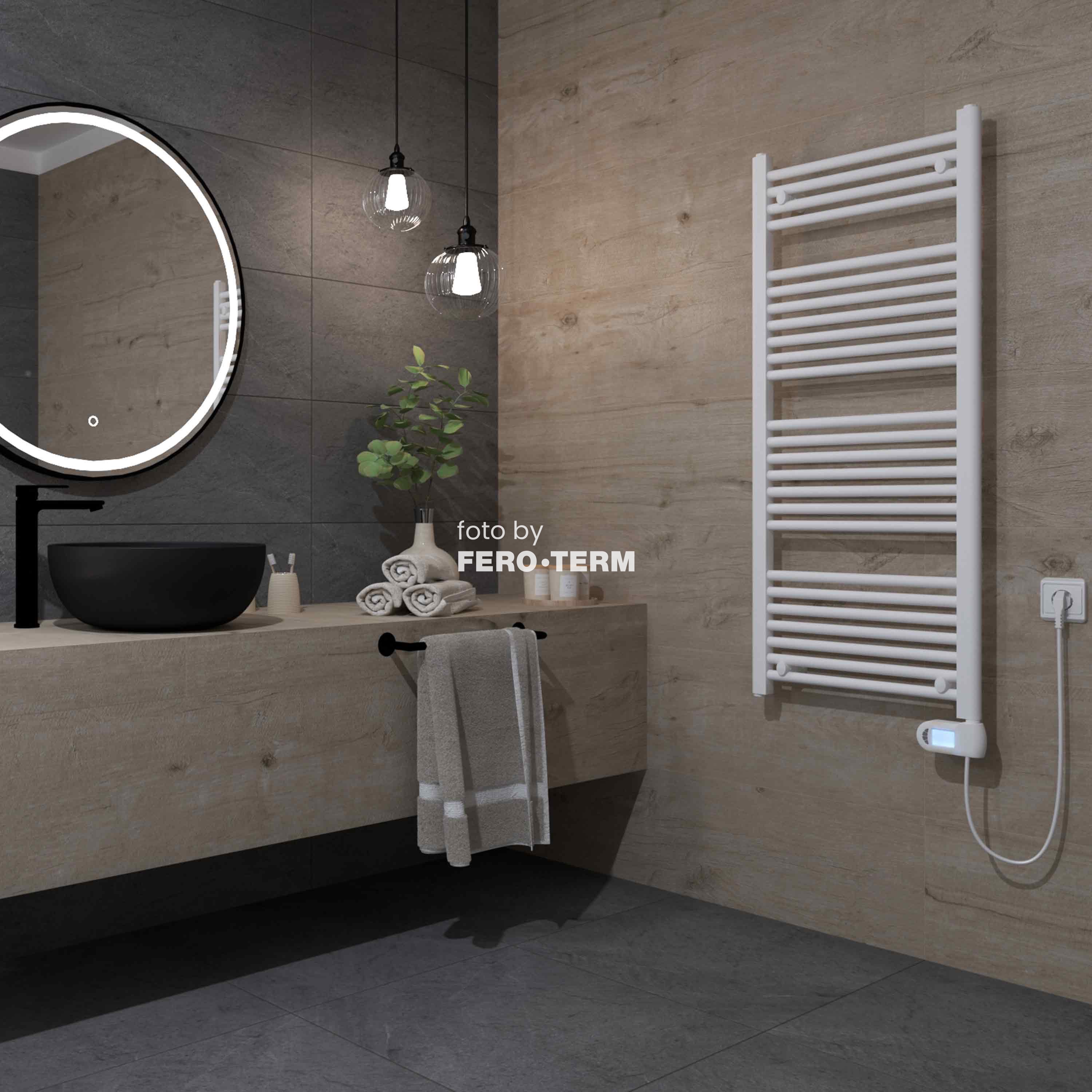 TermaBad R01 1200x500 mm, elegantni i učinkoviti električni kupaonski radijator ravnih linija. Idealno je rješenje za kupaonske prostore bez centralnog grijanja, jer je za njegov rad potrebna samo električna energija, a osim osnovne namjene grijanja prostora, može služiti i kao držač ručnika te zauzima minimalno prostora.