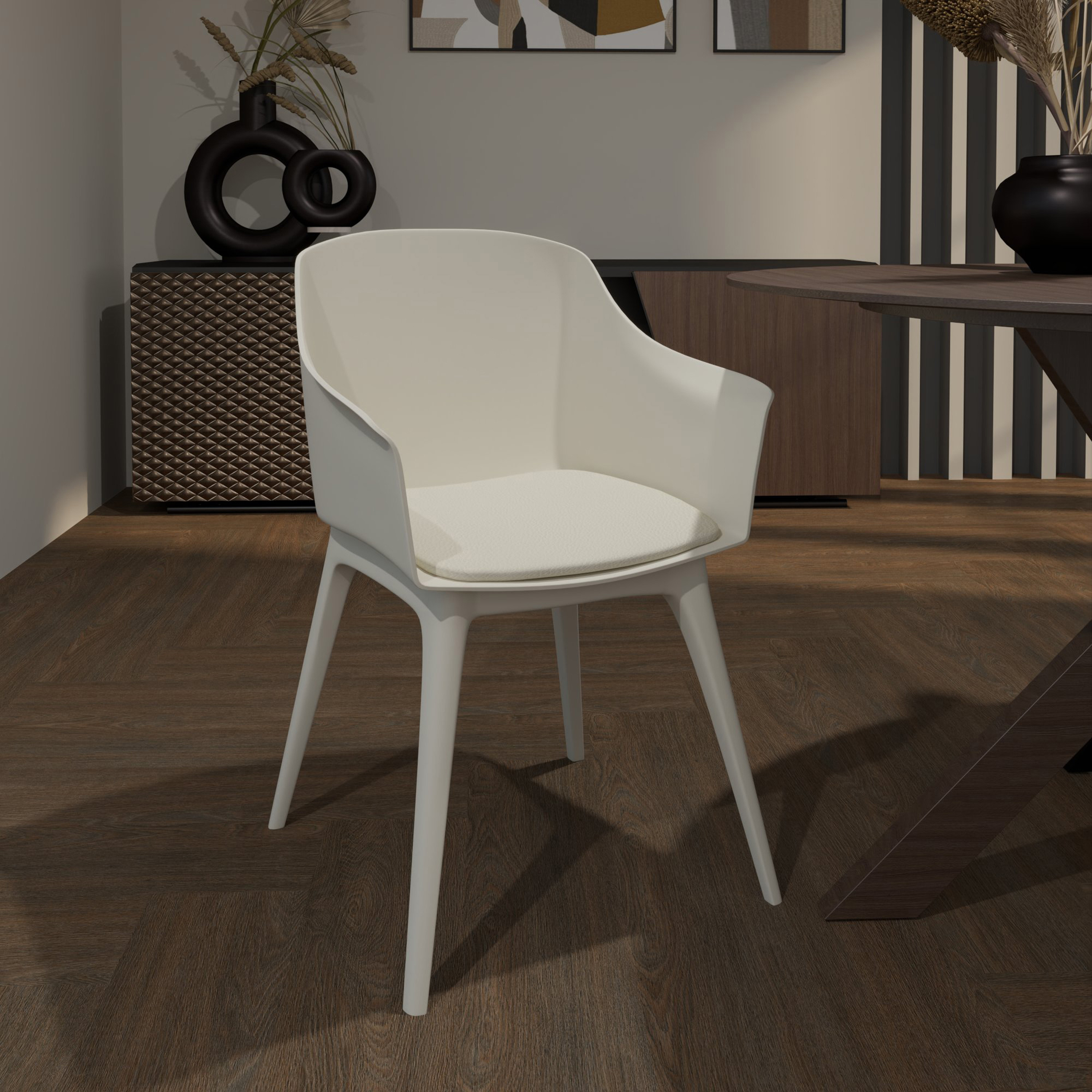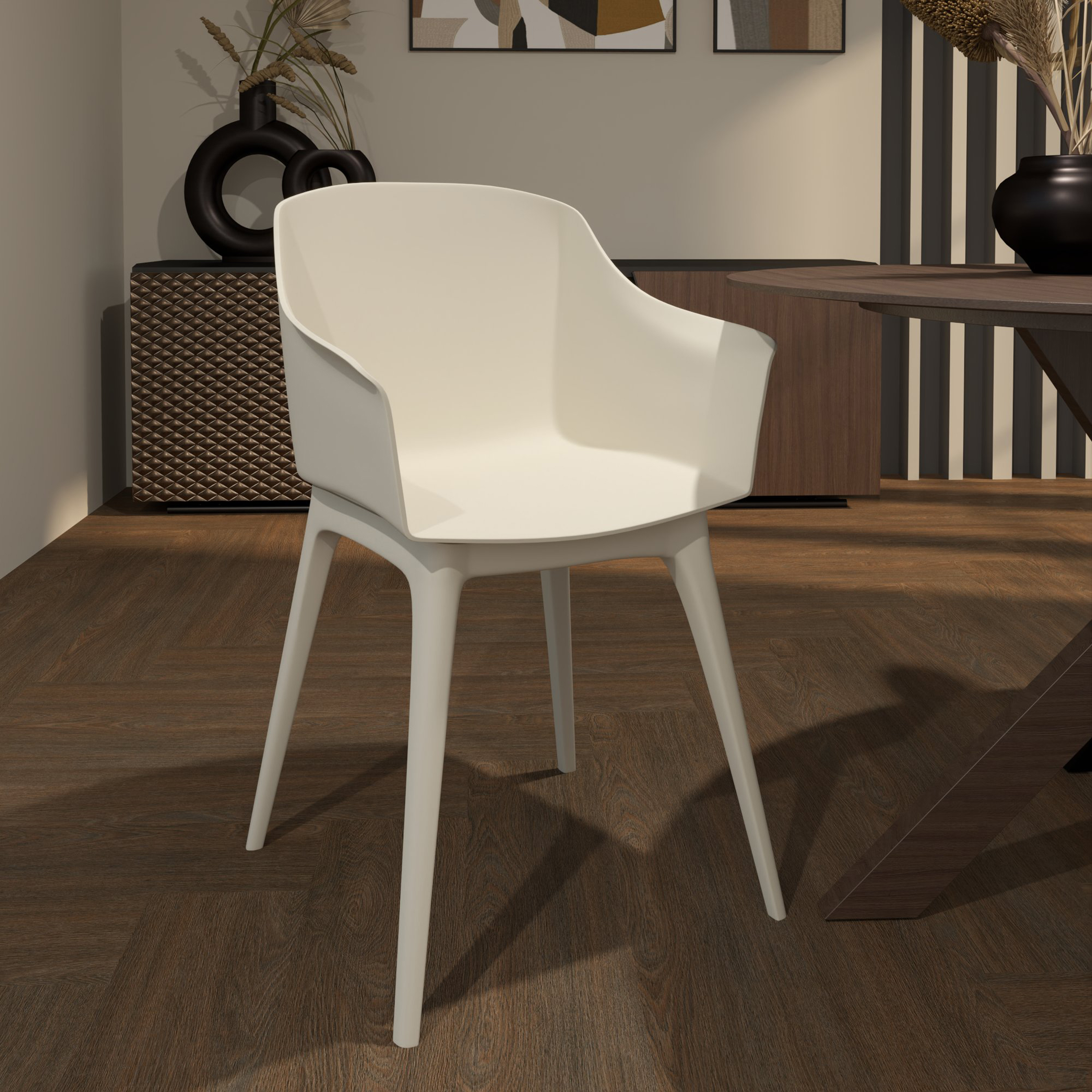 • Moderni dizajn: korra Zoe se ističe svojim elegantnim i suvremenim izgledom. Bež boja i zaobljeni oblik čine ovu stolicu idealnim izborom za svaki moderan interijer.
