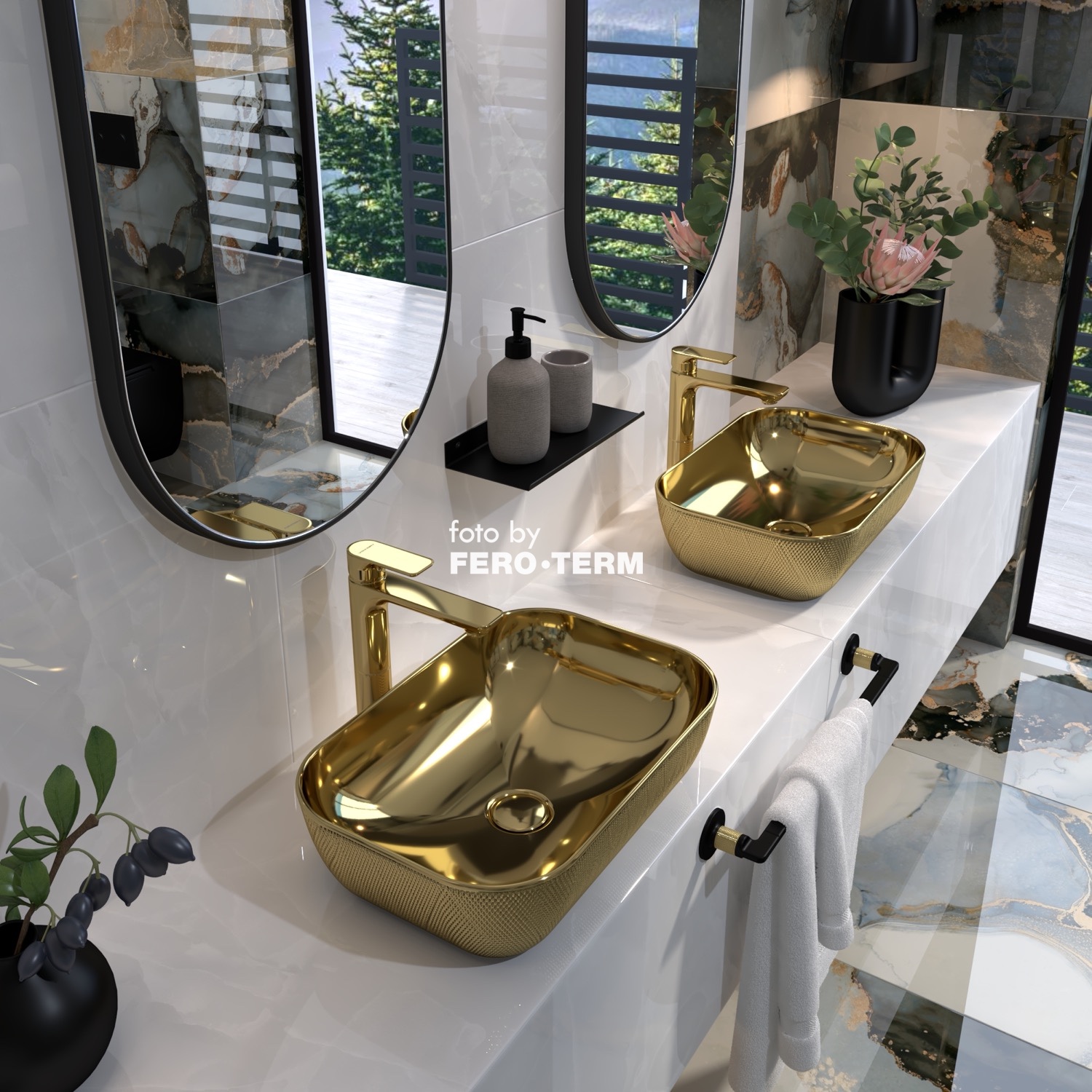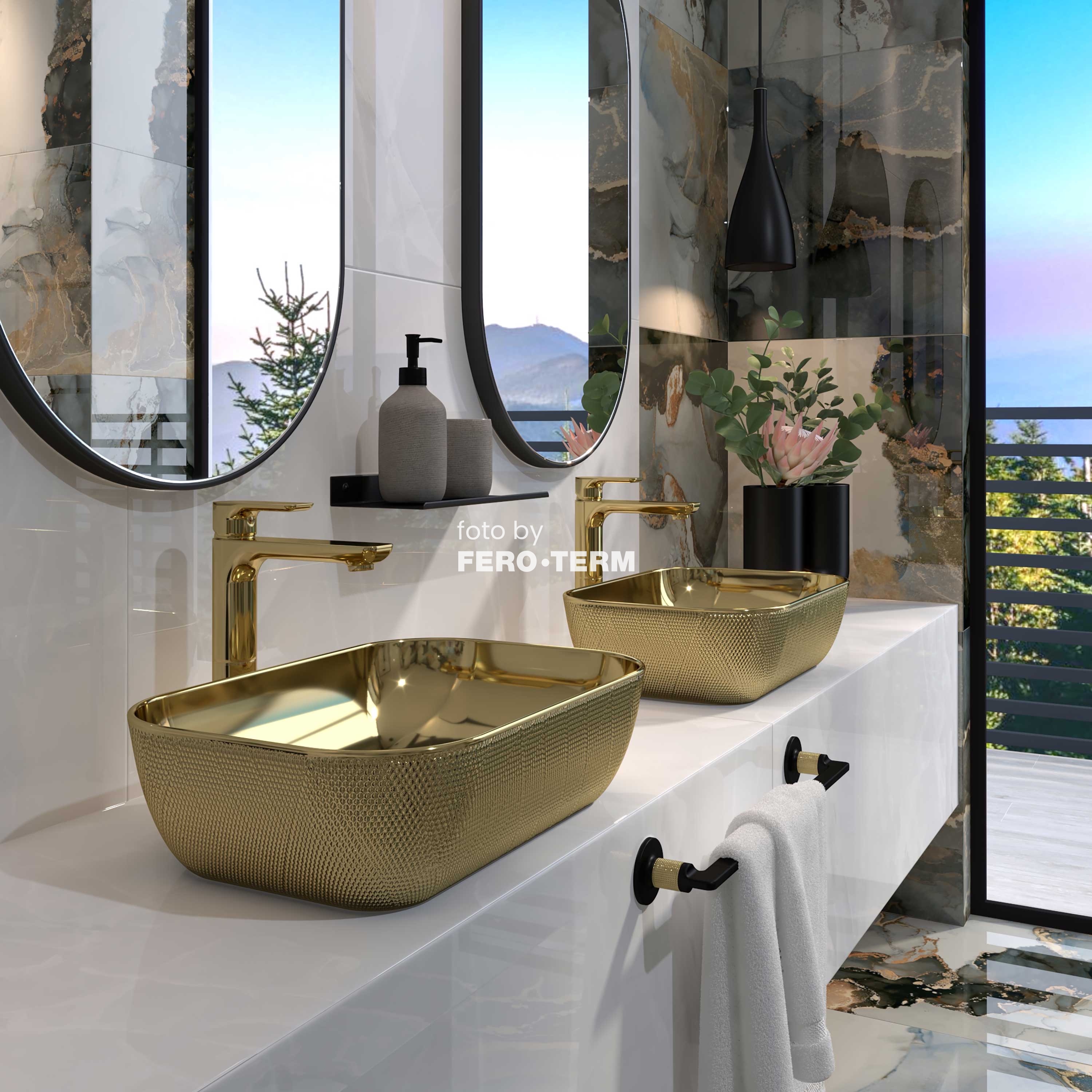 Nadgradni umivaonik Concepto Bell Romb donosi upečatljiv izgled zahvaljujući kombinaciji pravokutnog oblika, modernog dizajna i zlatne boje. Odlično se uklapa u suvremene kupaonice u kojima se želi postići dojam luksuza i stila. Osim što podiže estetiku prostora, praktičan je za svakodnevnu upotrebu i lako se kombinira s drugim komponentama zlatnih ili toplih tonova. Karakteristike: • Način ugradnje: na ploču (nadgradni) • Dimenzija umivaonika (ŠxDxV): 46,5x32x13,5 cm • Namijenjen za miješalice s visokim izljevom • Bez otvora za miješalicu • Bez preljeva • Boja: zlatna • Materijal: keramika • Jednostavno održavanje i čišćenje - blagim sredstvom za uklanjanje kamenca * Sifon i miješalica nisu dio isporuke te se kupuju zasebno. * Ton boje je karakteristika i tipična osobina keramičkih proizvoda u boji. Za vrijeme proizvodnog procesa može se pojaviti više verzija tonova koje mogu varirati po intenzitetu i nijansi. No međutim karakter dizajna je sačuvan.